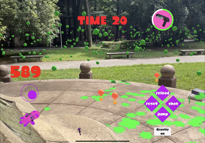 iPad ProのAR技術を活用したiOSゲームアプリを作成しました。Nintendoの人気Switchゲームを模した、ペイントゲームです。 学園祭に向けた出し物として、学科の友人らでチームを作り、自分がチームリーダーとなって、3ヶ月間開発活動を行いました。学園祭では多くの方々から評価をいただき、人気企画投票では部門別1位になりました。その後、改良を重ね、Apple Storeへのリリースも行いました。 開発環境としてUnityを使い、ARフレームワークのAR Kit、AR foundationを活用して、アプリを実装しました。