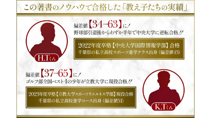 高3夏偏差値27から立教大学に短期間で合格した経験を活かし、勉強が苦手な生徒を短期間で成績アップさせる「スタディクエスト」を創業。高3夏偏差値34の野球部を半年で中央大学に合格。高2偏差値36の生徒を立教大学に現役合格などの実績があります。