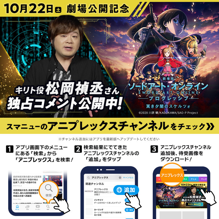 「劇場版 #ソードアート・オンライン -プログレッシブ- 冥き夕闇のスケルツォ」の公開を記念して、キリト役・松岡禎丞さんの独占スペシャルコメントをアニプレックス様ご協力のもと、スマニューで展開しました。