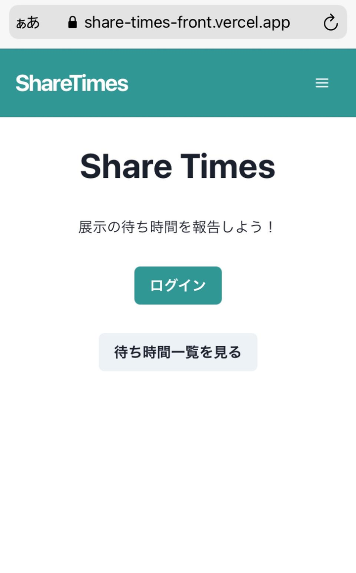 # share-times とは 学校文化祭における各展示の待ち時間を共有できるサービスです。 リアルタイムで展示の待ち時間を知ることができるので、混雑の緩和や観客のスムーズな誘導などに活かすことができました。 # 技術 frontend: Next.js (on Vercel) backend: Django influstructure: AWS(EC2 + ELB + Route53) # その他 フロントエンドを担当しました。 学校の先輩に依頼されて作成したアプリで、文化祭当日はたくさんの人に利用してもらいました。非常に好評をいただき、良い経験となりました。