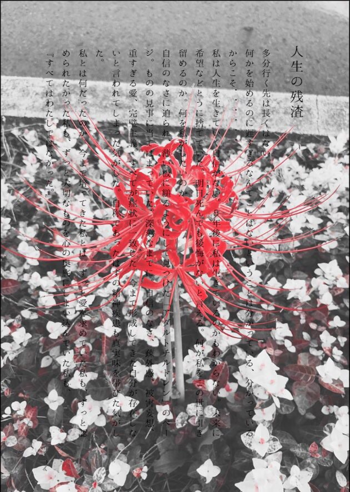 スランプにて写真を撮ることに満足が行かなくなって、新たな表現を目指して作った作品。鬱屈した未来に進む苦しさを死の象徴である彼岸花と共に詩にて表現。