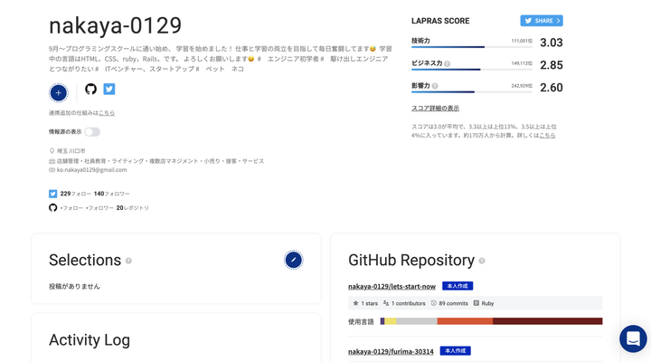 技術を可視化できるようにLAPURASの技術評価を後悔しています。 選考のご参考にして頂けると幸いです。 今後も成長していけるよう積み上げます!