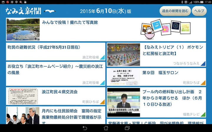 毎日夕方、浪江町や福島県の情報を配信するニュースアプリ。開発のきっかけは「お悔やみ情報 がみたい」というアイデアソンでの町民の声。どこ に居ても浪江町の情報が手に入る。福島県内の ニュースや浪江町役場からの情報、町民主催のイ ベント情報を自動配信。一番人気は町民自身が写 真と一言コメントを投稿するコーナー。