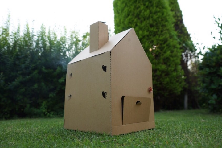 家の形をした燻製機。 ビスやネジを一切使わない組み立て式。