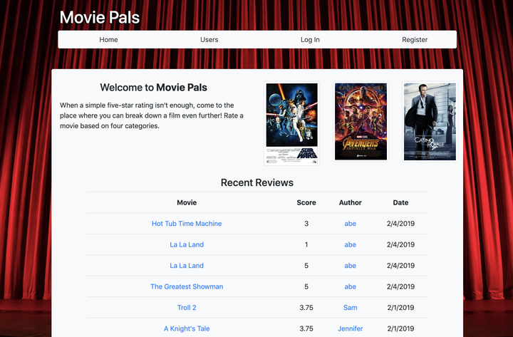 OMDbというオンラインデータベースのAPIを使用した映画レビューアプリケーション。 コーディングブートキャンプ中のグループプロジェクトとして作成しました。 ユーザーは映画タイトルを検索し、その映画のレビューを「ストーリー・音楽・演技・映像美」の4項目によって評価します。評価した映画はホームページに追加され、4項目の平均点がその映画の点数として表示されます。このプロジェクトはグループワークで行われたため、これを通してGitのPull Requestなどのグループワークを行う上で必要な技術的なことやコミュニケーションの必要性などを学ぶことができました。 Stack : JavaScript, Node.js Express.js, MongoDB, ejs Source code : https://git.generalassemb.ly/scott-mccormick/moviepals