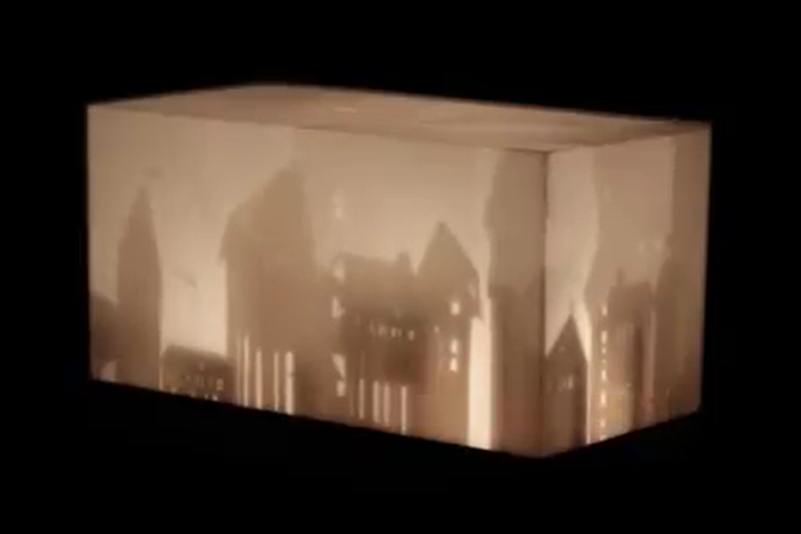 修士作品です。箱の中で回転テーブルに乗った2つのLEDがゆっくりと回転し、配置された小さい家や木々の模型の影が折り重なるように乳白色のアクリルキューブへ投影されます。