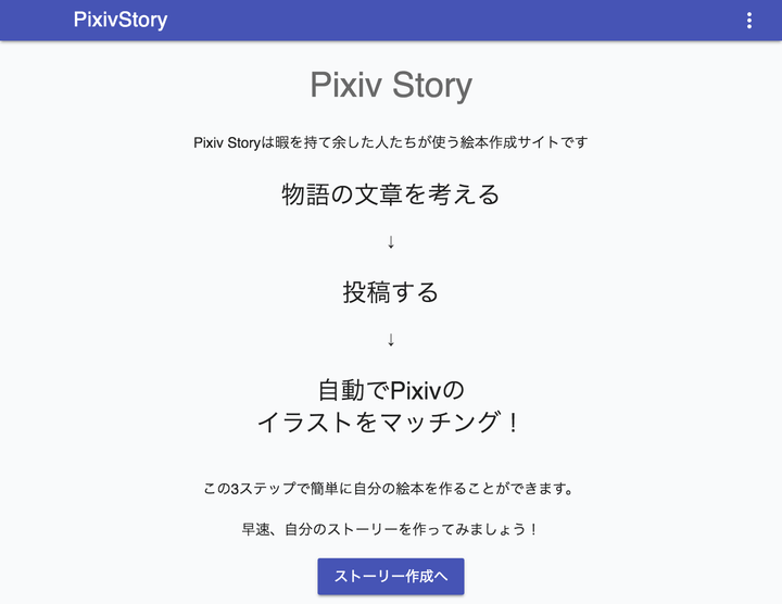 CodeHammerというpixivのハッカソンでのプロダクトです。物語を入力してもらうと、その文章に合っていると思われるpixivの投稿イラストを取得して、絵本をつくるwebアプリです。 初のハッカソンでしたが審査員特別賞をいただくことができました。 現在はAPIの権限がないため、新規作成はできませんが、過去の投稿は確認できます。 追記:過去の投稿の画像表示もできなくなっていました...