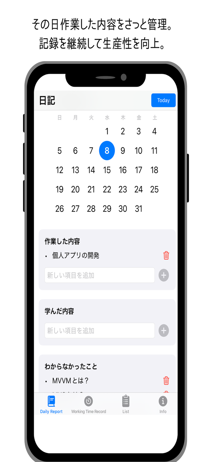 日記機能で学びを記録、タイマー機能で作業時間を可視化、リスト機能で課題を管理。効率的な時間管理と成長をサポートするアプリを開発しました