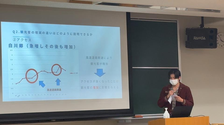 私は20人からなる社会調査ゼミに所属しており、「世界遺産の観光地としての側面」を約一年間研究しました。 この写真は他大学生の前で研究内容を発表している社会調査インターカレッジでの様子です。 私が代表を務め、調査結果の発表や報告書の作成を担いました。裁量の大きい仕事にやりがいを感じます。 このゼミ活動の中で最も困難だったことは、活動当初、メンバーの士気の格差により毎回約1割のメンバーが欠席し、議論や資料収集が進展しなかったことです。 現状を変えるべく、個人の役割が不明瞭である点と欠席者が調査状況を把握できない点が課題であると仮説を立てました。そこで全員が当事者意識を持つべく、一人ひとりに個人課題を割り当てました。また、SNSで講義内の学びや今後の方針を共有し、欠席者も含めた全員が調査の現状を把握できるように工夫しました。 それにより、欠席者はゼロになり、組織のモチベーションを向上させることができました。働く上でも周囲に働きかける主体性を大事にしたいです。