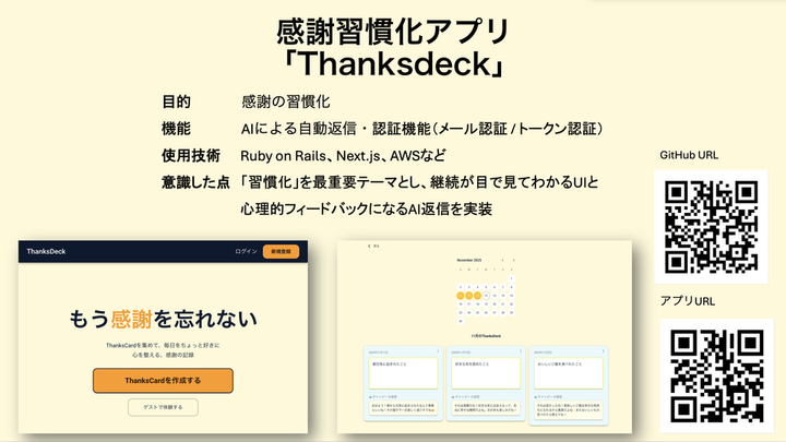 ご覧いただきありがとうございます。 私は現在Web開発エンジニアへの転職を目指しており、 今回ポートフォリオとして、ThanksDeckという感謝記録アプリを個人開発しました。 thanksdeckのURL:https://thanksdeck.com 開発背景や使用技術、開発の振り返りをまとめています。 GitHubのURL:https://github.com/taku365/ThanksDeck