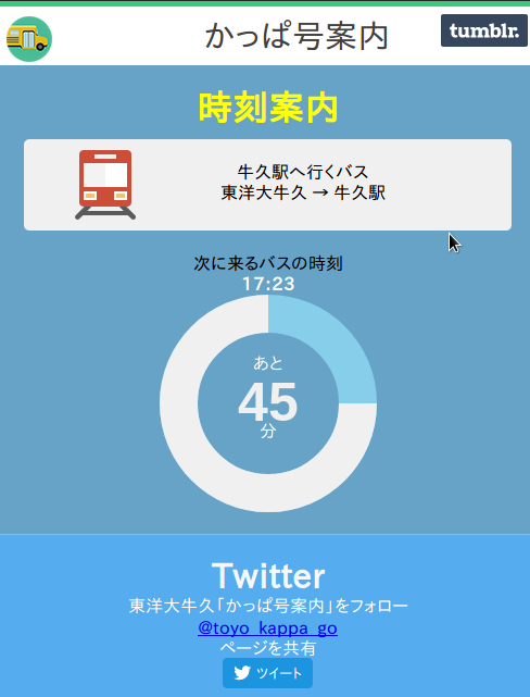 高校と駅の間を運行するコミュニティバスかっぱ号の時刻表Webページ。次に来るバスの待ち時間の表示。