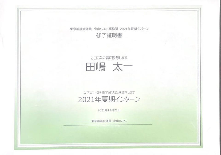 議員インターンを通して政治家と社会がどのように結びついているのか、社会に対して具体的にどのような影響を与えているのかを身近で体験することが出来ました。 業務を行う中で、社会的なマナーや作法、言葉遣い等を身に付けることが出来たと同時に政治家の活動の大変さも知ることが出来ました。