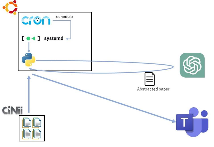 合同輪講が近づいて来ました。教授達から論文を読めとせかされます。しかし、世の中に存在する論文に目を通していると日が暮れてしまいます。 そこで、今回は自動で論文を収集し、ChatGPTで要約し、それをteamsに送信する様なツールを作成した。 現時点ではCiNiiにしか対応していない。 参考元サイトさんでは、クラウドを用いていたがまだ学生の私には少し手が出せない。今回はオンプレのみで実装した
