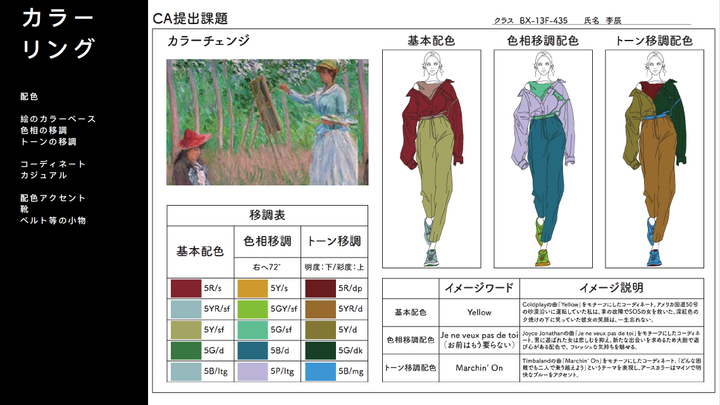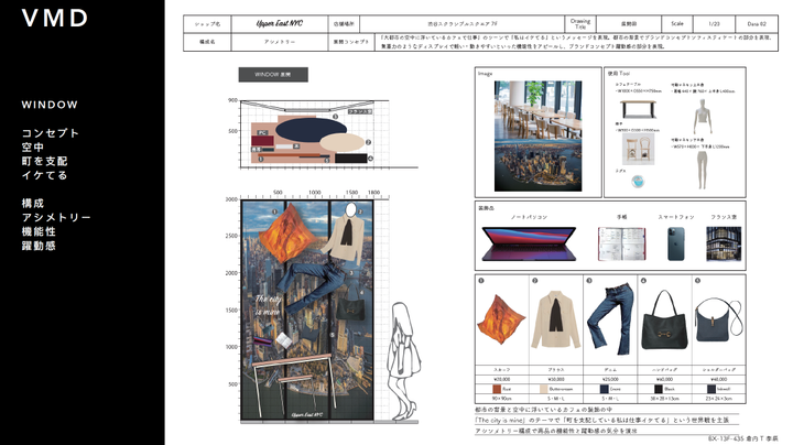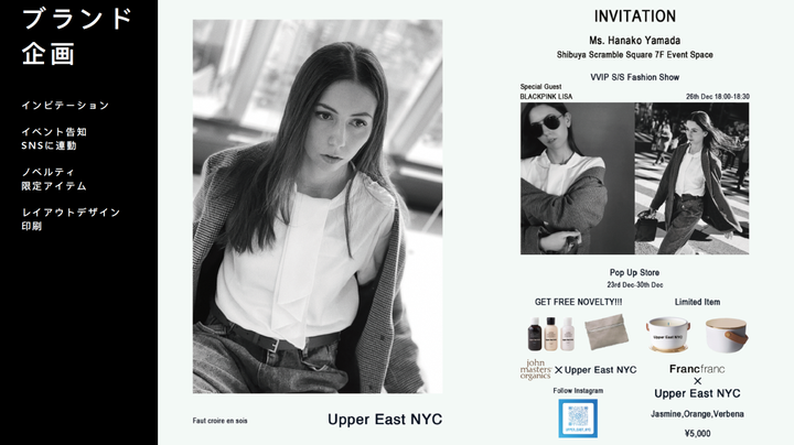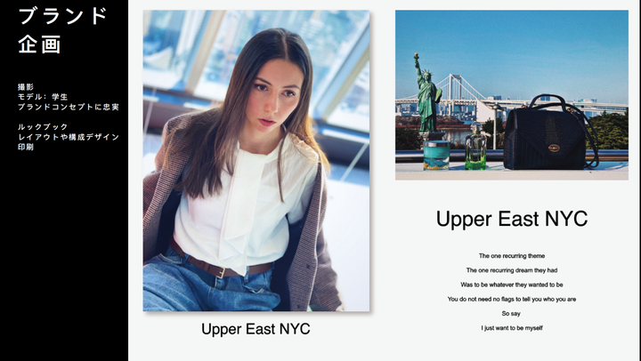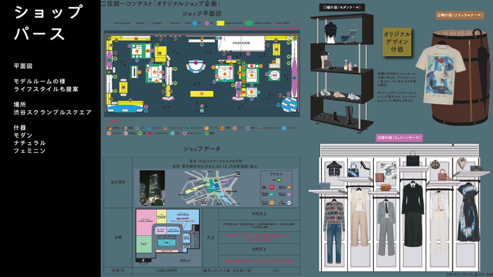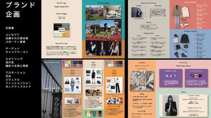 ブランド企画書、撮影、ルックブック、VMD、店舗設計、カラーリング、データ分析等の作品を作成しました