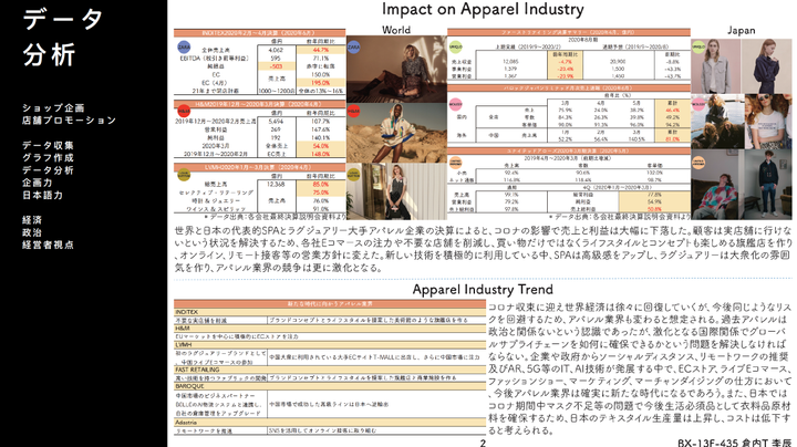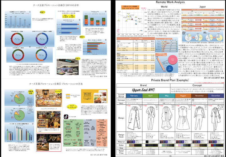 ◎プロジェクト要約 ソフィスティケートにスポーティの要素を加え、フォーマルとカジュアルを融合するコンセプトで在宅ワークのOLに向け、仮想のブランドを企画し、ブースで展示しました。 ◎プロジェクト内容 ・企画書を作成(ロゴ、コンセプト、ターゲット、配色、立地、MD戦略、PRイベント提案、スタイル提案) ・服装リメイク(縫製等) ・モデル撮影(ルックブック作成、PR動画作成、PRイベントインビテーション作成) ・店舗設計(平面図、立体模型、VMD) ・展示会(ブース装飾、マネキン等で店舗の一部を表現) ◎役割と実績 ・7人のリーター役、役割分担等を遂行した ・企画書、モデル撮影、店舗設計のVMD部分を実行し、作成した ・全学校の先生からの投票数は一位を取った