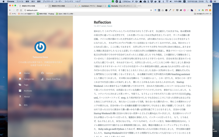 ベンチャー、startupに興味を持っています。自分の力で、熱い思いの方たちと、働きたいと思っています。 世界の中には不条理なことがまだまだたくさん不条理なことがあるので、それらを一夜にして変えていきたいと考えています。 そのためにも今の自分に必要なことは何なのかを理解して、自分のできることを増やす努力をしていきます。