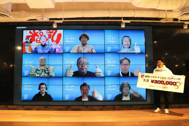 株式会社PECOFREEは、2022年2月8日(火)に開催された「福岡ビシネス・デジタル・コンテンツ賞2022」公開審査会に、事前に厳しい審査を通過した企業や各関連コンテストから選出された13社のうちの1社として、代表取締役の川浪達雄が登壇いたしました。 5分間という短い時間の中で、審査員たちに向け、学生専用のお弁当出前アプリ「PECOFREE」のサービス説明や現在の学生、保護者、教育機関の課題、弊社が解決していきたい想い、今後のフェーズを含めたピッチを披露。 結果、製品化の可能なデジタルコンテンツ作品・事業において最も優れた企業に贈られる「大賞」を受賞し、副賞30万円の贈呈と表彰状・トロフィーを改めて福岡県知事から県庁にて表彰式を行い授与されます。