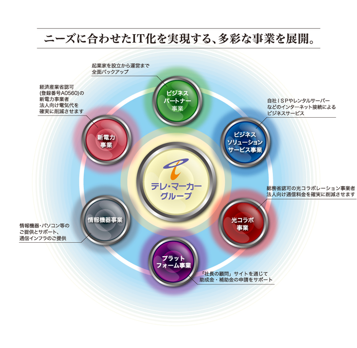 「株式会社テレマーカーに頼めば、どんなこともわかりやすく、簡単に説明してくれる」と言っていただけるよう、安心感を持って信頼して任せてもらえる、そんな価値ある会社を目指します。 テレマーカーが果たすべき使命は、お客様の求める「今」を届けること。知らずに損をすることのないように、新しいお得な「今」を届けたいと考えています。 テレマーカーは、お客様のビジネスの業務効率化・コストダウンを実現するプロフェッショナルであるため様々なサービスを展開していますが、中でも2本柱となるのは、情報機器事業・プラットフォーム事業です。 ■情報機器事業 私どもテレマーカーはNTT東日本・西日本の特約店として、日本全国に支社を設置。お客様それぞれの通信環境のお悩みに合わせて、インターネットセキュリティシステム・サーバー・クラウドサービス・ビジネスホン・複合機・パソコンといったソリューションをご提案しています。ただ単に商材やサービスをご提供するのではなく、クライアント様の課題を一緒に探し、解決のお手伝いをさせて頂きます。 ■プラットフォーム事業 事業者の取り組みをサポートするために、クライアント様にとって有益となる「補助金」や「助成金」を扱っています。クライアント様が受給できる可能性がある補助金・助成金を探し、申請のお手伝いをさせていただくことで、中小企業様に対し、経営改善の支援を行っています。