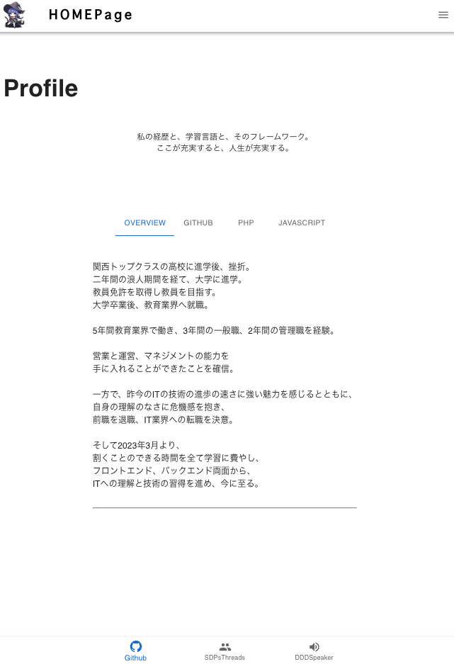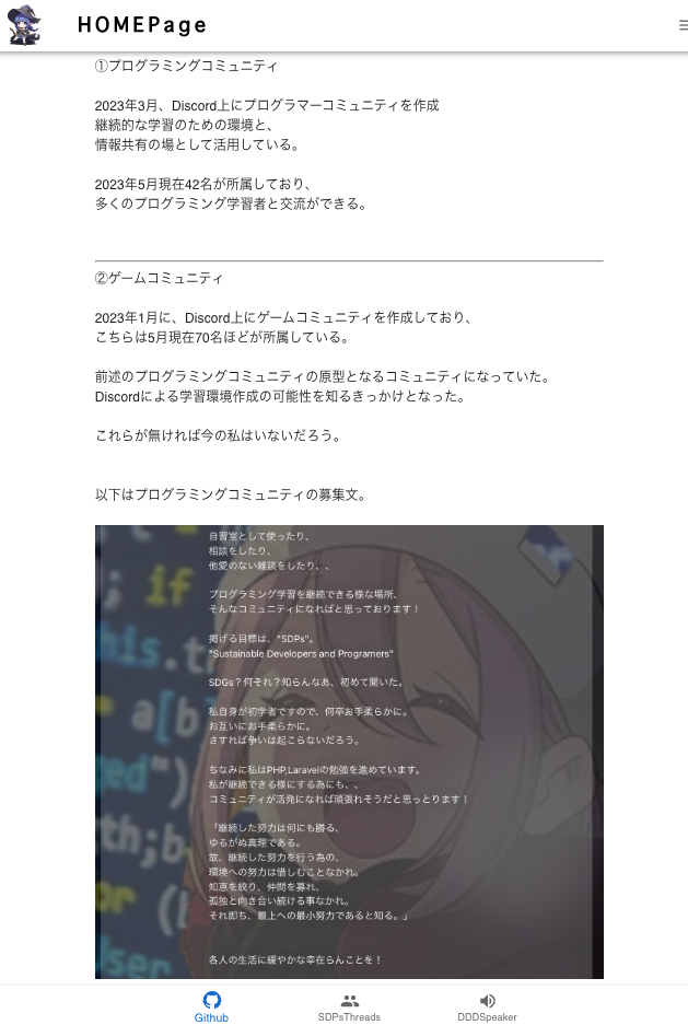 IT業界へのキャリアチェンジを実現するために、2023年3月より割くことのできる時間を全て学習に費やし、フロントエンド、バックエンド両面から、ITへの理解と技術の習得を進めている。 プログラミング学習コミュニティを作成して、継続的な学習を行っている。