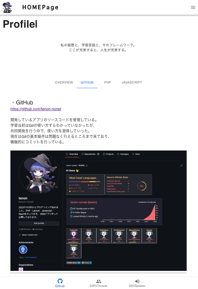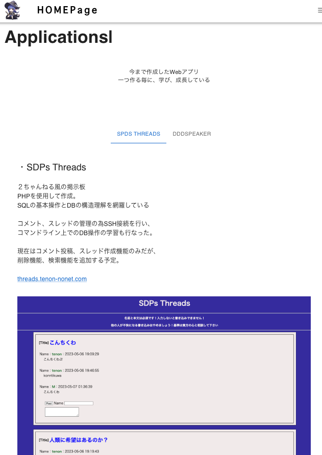 フロントエンド、バックエンド両面からITへの理解と技術の習得を進めている。 Javascript、ReactとPHPを使用して掲示板Webアプリと読み上げWebアプリ、ポートフォリオサイトを作成した。VPSを使用して、HPを公開。バックエンドの学習も進めている。