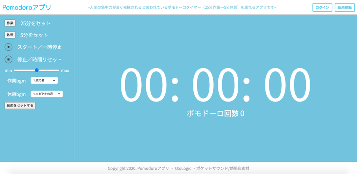 人間の集中力が高く発揮されると言われているポモドーロタイマー(25分作業→5分休憩)を測れるアプリです。 トップページの上部に簡単な説明のみ記載し後はユーザーが直感のみで操作できるようにしてあります。なるべくシンプルで直感的な操作で利用できるものを開発しました。 また、アプリ自体もSPA化をJavascriptで行い殆どページの遷移なく動作します。