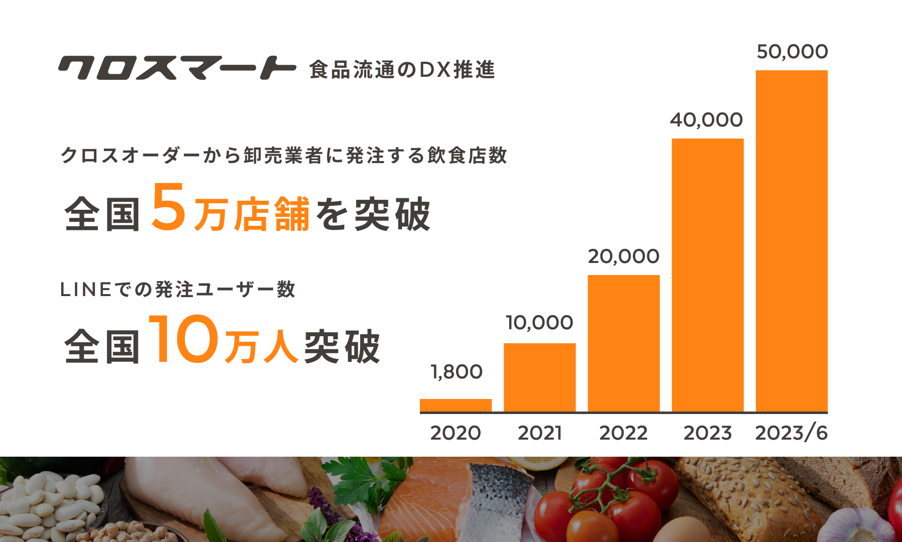 「想像力とテクノロジーで、外食産業の発展に貢献する」というビジョンのもと、外食産業のDXを推進しています。飲食店と卸売業者をつなぐ受発注プラットフォーム「クロスオーダー」、LINEを活用したオンライン販促機能「クロスオーダー販促」、電帳法に対応した請求書DX機能「クロスオーダー請求書」など、外食産業のアナログな業務をデジタル化すべく、さまざまなサービスを展開しています。
