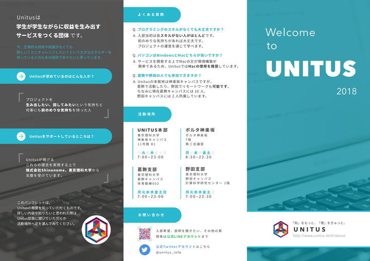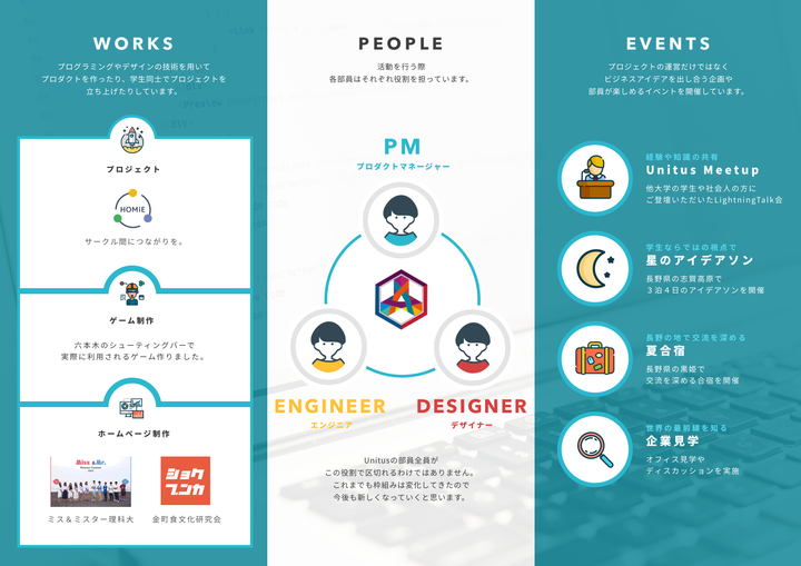 所属している学生団体の新入生説明会用にA4サイズ三つ折りのリーフレットを制作。