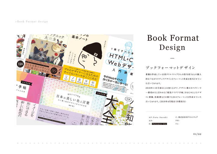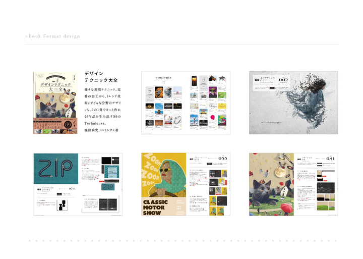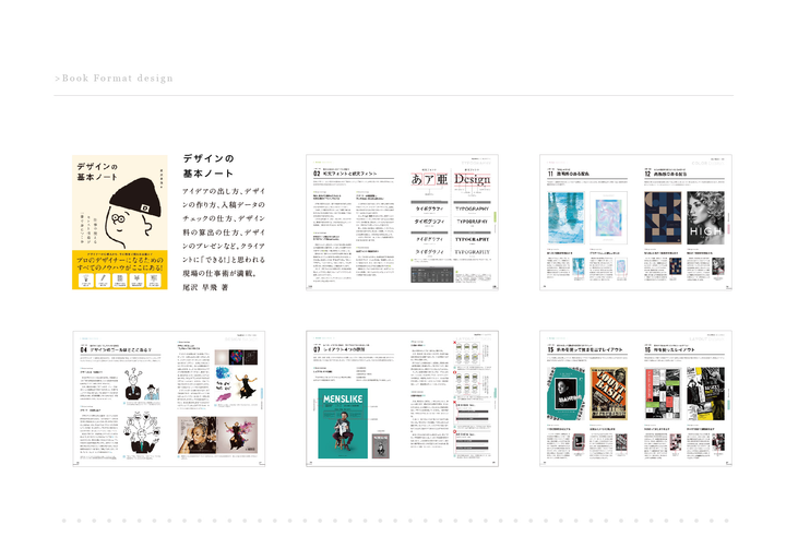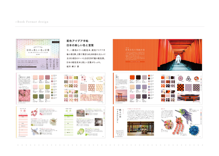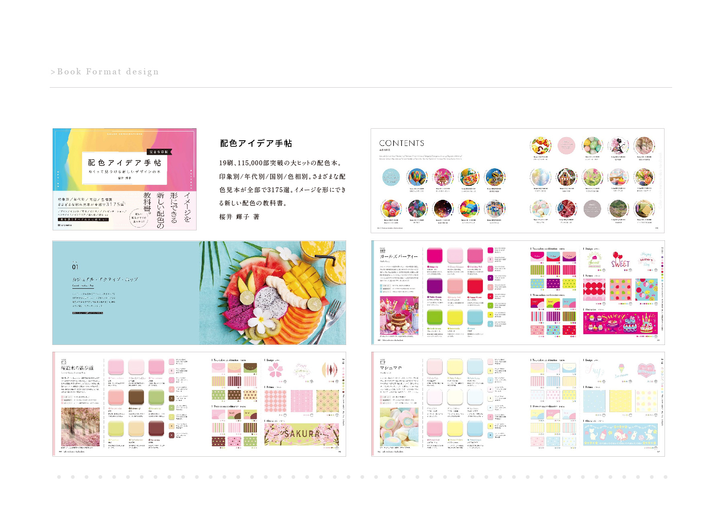 2018年より行なっているデザイン本や技術本などを中心とした本のフォーマットデザインです。デザインと同時にページごとの見せ方などでも関わらせていただいたいます。フォーマットを担当させていただいた本からは「配色アイデア手帖」のようなヒット本も生まれ、普段のデザインワークとは種類の違った仕事をさせていただいています。