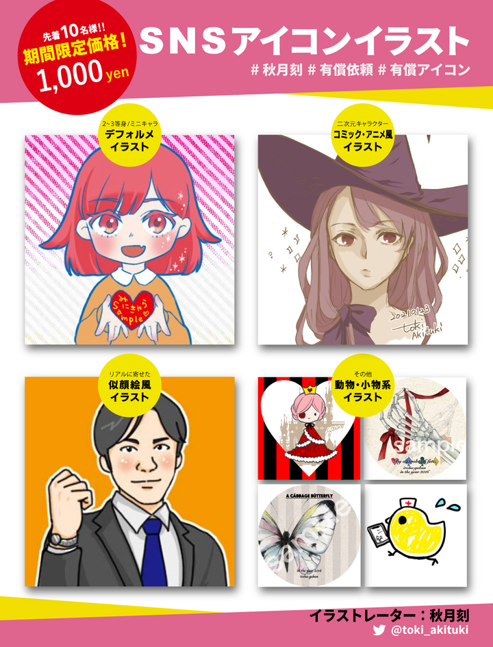 【SKIMAまたはココナラ経由にて受注受付中】 プライベート用からビジネス用まで! SNSに使用できる『アイコンイラスト』を承ります! ▶︎注文いただける内容について ・バストアップ(顔〜肩)のみ ・簡易背景(ベタ塗り・簡易エフェクト・フリー素材使用など) ・簡易な服装 ・簡易な小物1点まで追加可能(アクセサリー含む) ・手の描写追加無料 ・文字入れ無料 ▶︎お受けできないもの ・版権作品や他人の作品など第三者が著作権を保有するもの (購入後に発覚した場合、全責任はクライアント側にあるものとします。ご注意ください。) ・R18指定のもの、過度なグロテイストのもの
