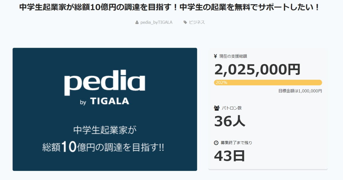 TIGALA 「pedia venture program」のクラウドファンディング開始2日目にして目標金額の200%達成!