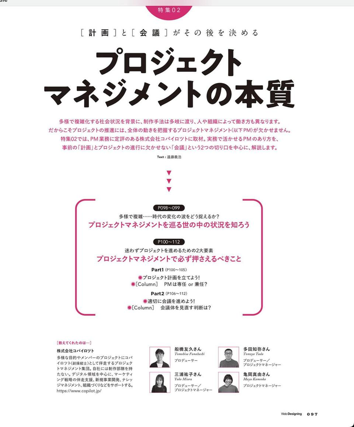 「Web Designing 2025年4月号」の第2特集で、プロジェクトマネジメントについての取材協力&監修をさせていただきました。弊社メンバーと共に、できてること・まだこれからなことも含め16ページに渡りお話しさせてもらっています。 ・PMを取り巻く社会背景 ・プロジェクト計画の重要性 ・PMは専任?兼任? ・会議の適切な進め方 などのトピックにふれています。