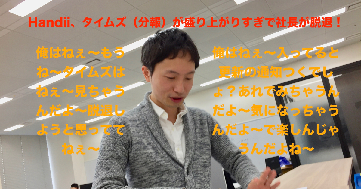 1月某日、社長が宣言しました。「俺、タイムズから退室する!」CEO柳おっと、こんにちは、Handiiです。タイムズってなんのことかって?ああ、そこからですか。Handiiでは、社内のチャットツー...