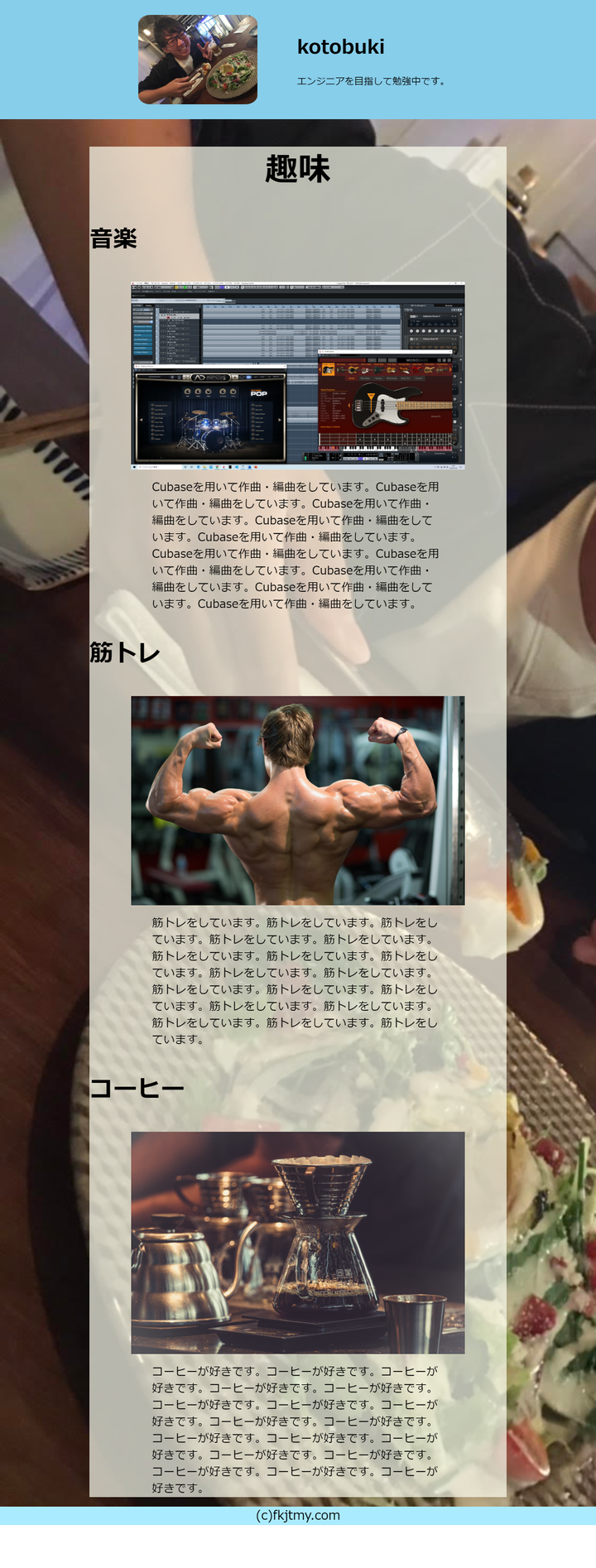 HTML、CSSで自己紹介ページを制作しました。拙い点はございますが、今後も研鑽を務める所存です。 何卒よろしくお願いいたします。