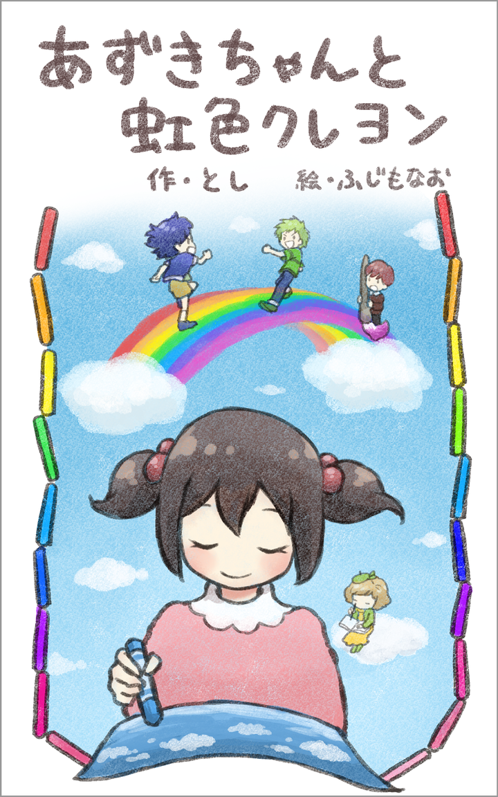 お豆が大好きで、おはぎを貼り付けたようなかわいいあずき色のほっぺをした小学生の女の子あずきちゃん。 あずきちゃんにはもう一つ好きなことがあります。それはお絵描きです。あずきちゃんが絵を描くとみんなが笑顔になります。あずきちゃんはその笑顔が大好きです。 ーーーーーーーーー 放課後の教室で寂しそうにたたずむ紅太(こうた)くん。 あずきちゃんは紅太くんを励ましたくて、紅太くんの絵を描いてプレゼントしました。 絵を見て微笑む紅太くん。でも、まだ気になることがあるようで落ち込んだままです。 紅太くんの力になれなくて、あずきちゃんはすっかり悲しくなりました。 あらあら、ちょっと待ってあずきちゃん。 ほら、その日の晩のことですよ。あずきちゃんがプレゼントした絵がきっかけで不思議なことが……。 そして紅太くんは……。 (『赤色のクレヨン』より) ーーーーーーーーー 『あずきちゃんと虹色クレヨン』は、あずきちゃんと七色のクレヨンにまつわる登場人物が織りなす、心温まる七つのお話です。 お絵描きが大好きなあずきちゃんが描く絵は、あずきちゃんの友達を幸せにできるのでしょうか?