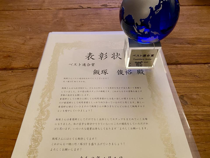 訪問看護師として、地域医療や患者様の生活スタイルや現場の状況に合わせた応用的な医療の提供について学んだ。在宅での看取り対応も多く経験し、「その人らしさ」を意識した生活について貴重な経験を得ることができた。また、入社1年後に主任へ昇格し医療職としては珍しい営業業務や管理業務を行いつつ、社内総会では適合賞という社内MVP賞を獲得することができた、