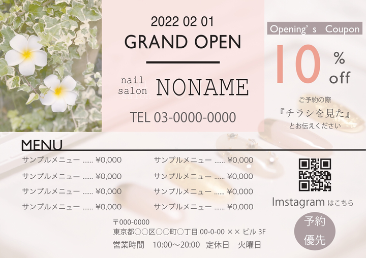 使用:Adobe Illustrator 架空のネイルサロンの開店告知チラシを作りました。 以下サロンの設定です。 想定される客層は20代前半-30代後半、キレイ系とナチュラル系のネイルデザインが得意。店内は花と観葉植物を中心とした装飾が施され、席数は3から4で予約優先の小規模店舗。
