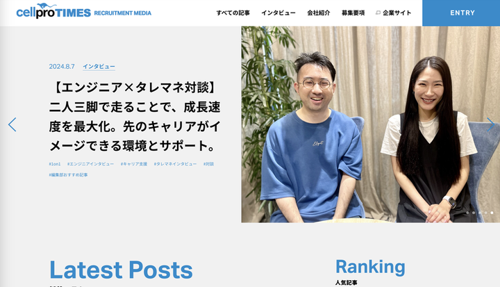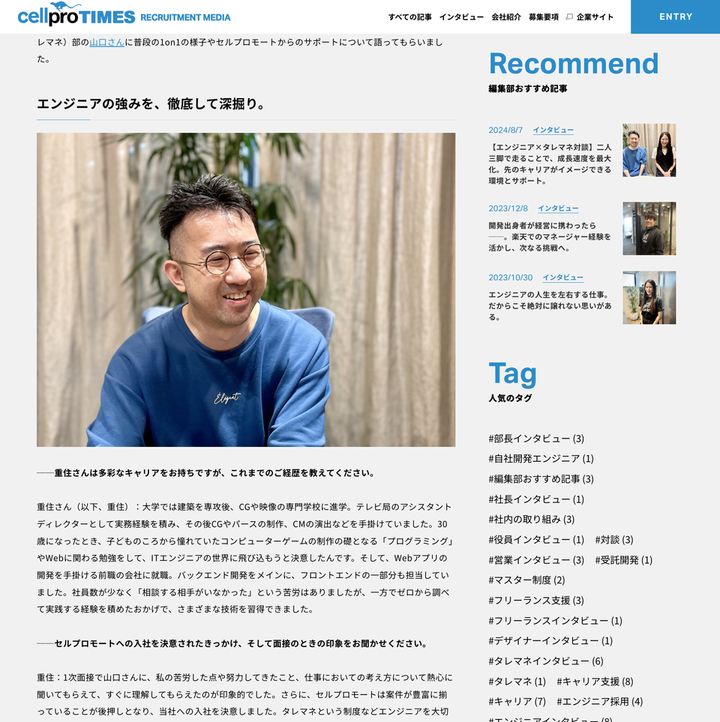採用オウンドメディア『セルプロTIMES』を企画、運用。 セルプロモート社員の声を発信し、共感採用を実現したいと考え、エンジニアや人事(タレマネ)、営業などあらゆる職種の社員にインタビュー。各々がなぜセルプロモートに入社したのかや、今後叶えていきたい目標、挑戦したいことなどをご紹介しています。