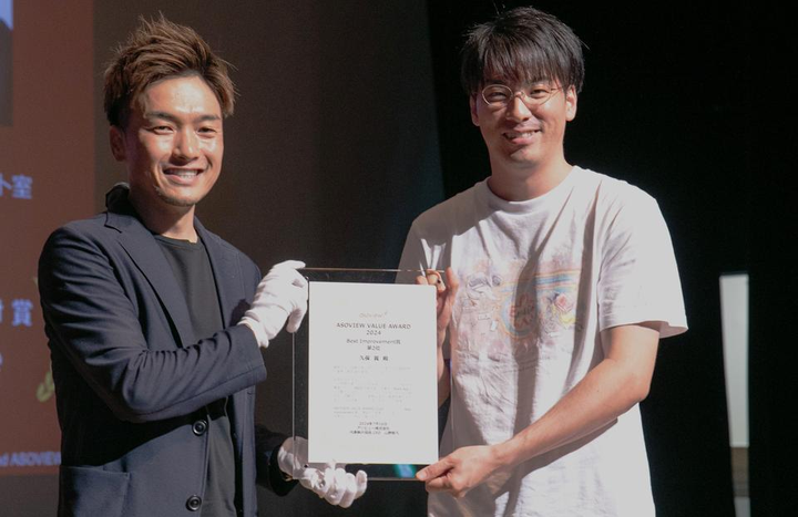 半年間で、コーポレートカルチャー推進室の工数を200時間短縮したことを表彰された。写真はアソビューCEOの山野さんとのツーショット