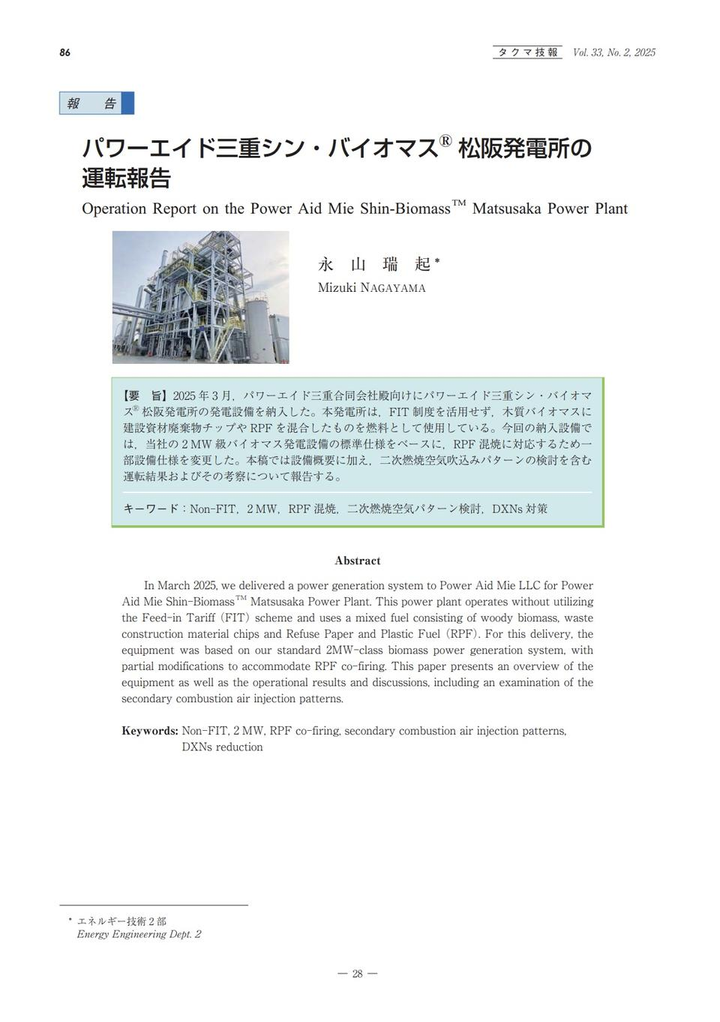 プラントメーカーの株式会社タクマさまが発行の「タクマ技報 VOL.33 NO.2」(2025年12月発行:通巻第65号)に当社グループの「パワーエイド三重シン・バイオマス®松阪発電所の運転報告」が掲載されました