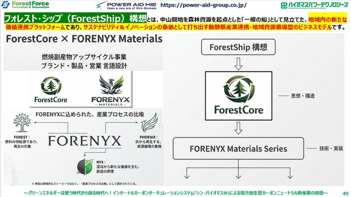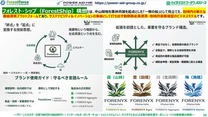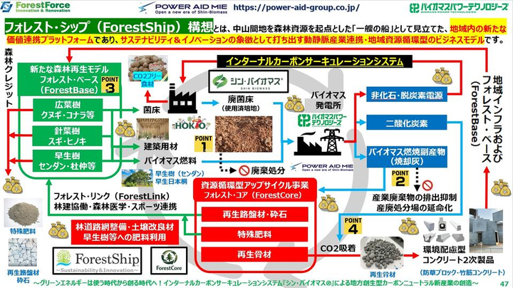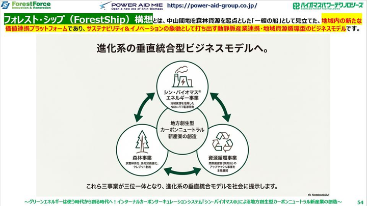 Forest Ship(フォレスト・シップ)構想とは、中山間地を森林資源を起点とした「一艘の船」として見立てた、地域内の新たな価値連携プラットフォームであり、サステナビリティ&イノベーションの象徴として打ち出す動静脈産業連携・地域資源循環型のビジネスモデルです。 https://www.youtube.com/watch?v=EO3V0uwygAU 社内・社外関係者の皆さまの温かいご支援とご鞭撻により、 当社は 11 年目を迎えることができました。2026年は、このForest Ship(フォレスト・シップ)構想の社会実装を本格化させるとともに、 資源循環事業部を中心とした燃焼副産物のアップサイクル事業を本格的に展開してまいります。 これにより、シン・バイオマス®エネルギー事業・森林事業・資源循環事業が三位一体となった、 進化系の垂直統合型ビジネスモデルを、より明確な形で社会に提示していく所存です。