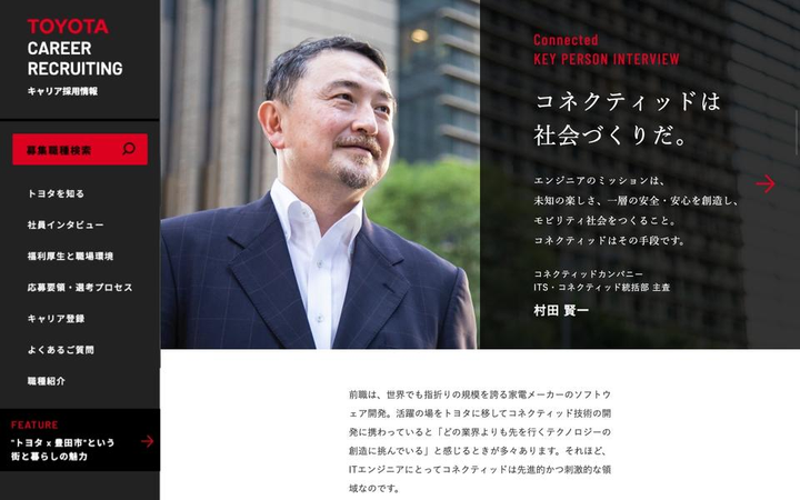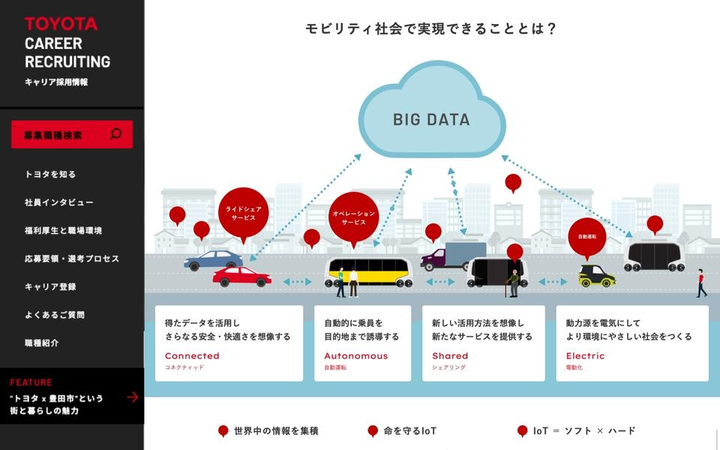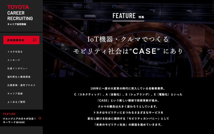 自動車メーカーということで化学系技術者のイメージが強いトヨタが、Maas企業を目指すために大量のソフトウェア人材を獲得するため、自動車業界が進めるべき次世代トレンドCASEを軸に特集を提案し、キャリア採用サイト内に特集ページを組み込んだ。