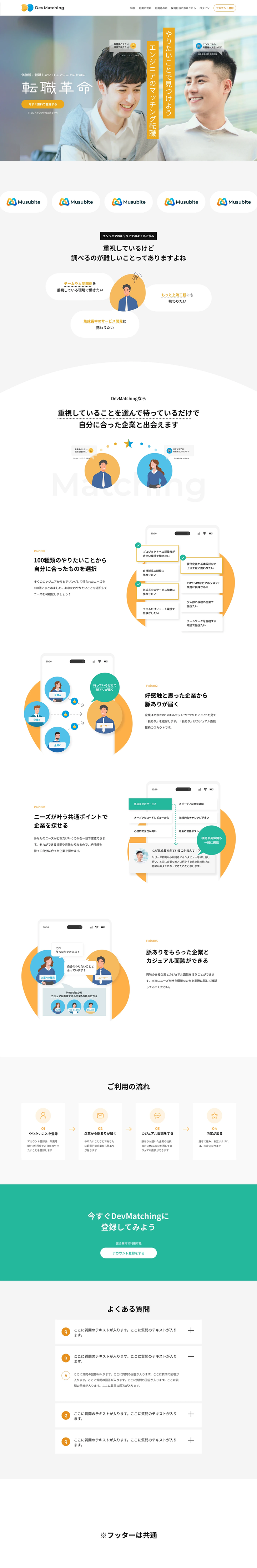 ■プロダクト概要 某サービスのLPを作成させていただきました。 ■工夫した点 ・わかりやすいファーストビューを意識 ・レスポンシブ対応 ■言語・ツール HTML, SCSS, jQuery,PHP, Wordpress Figma Adobe XD