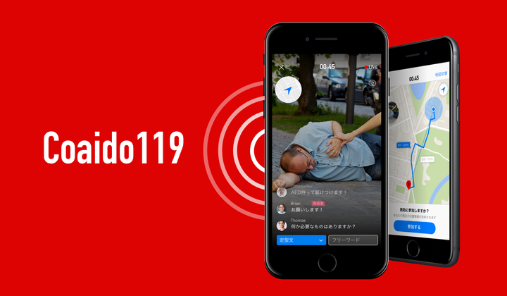 心停止は1分ごとに約10%救命率が低下しますが、全国の救急車到着平均時間は約8.6分です。Coaido119は、心停止の現場から、近くの医療有資格者や救命講習受講者、AED設置者等にアプリでSOSを届けるシステムを提供しており、UIデザイナーとして参画しています。