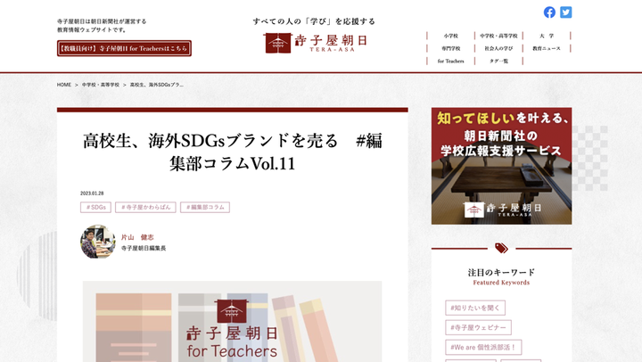 【記事掲載】朝日新聞社 寺子屋朝日「高校生、海外SDGsブランドを売る #編集部コラムVol.11」