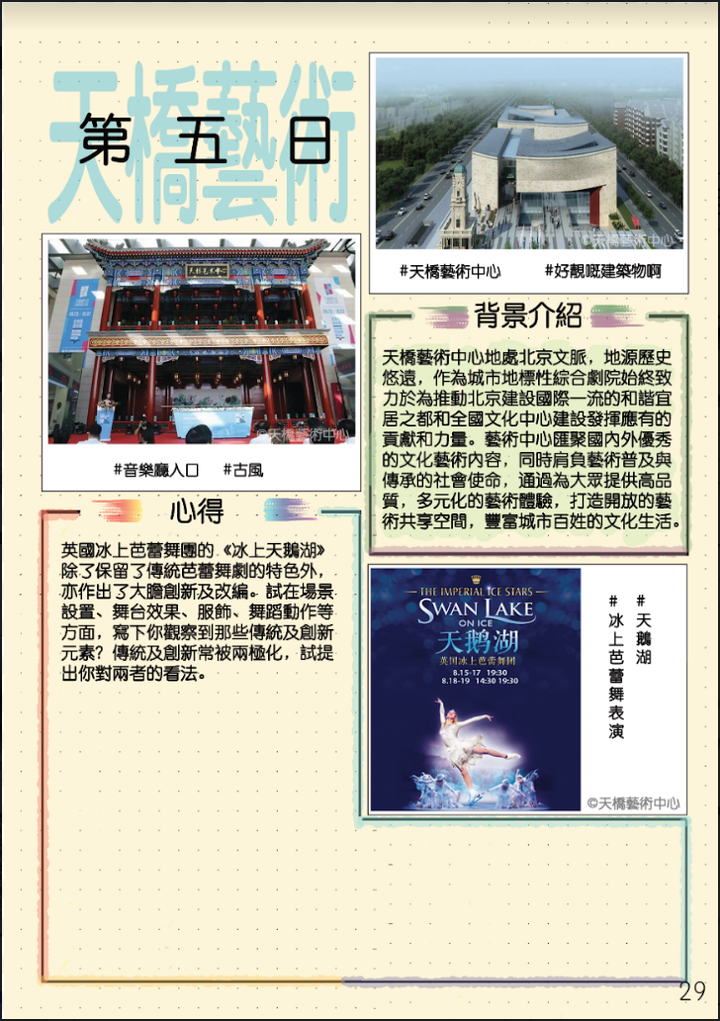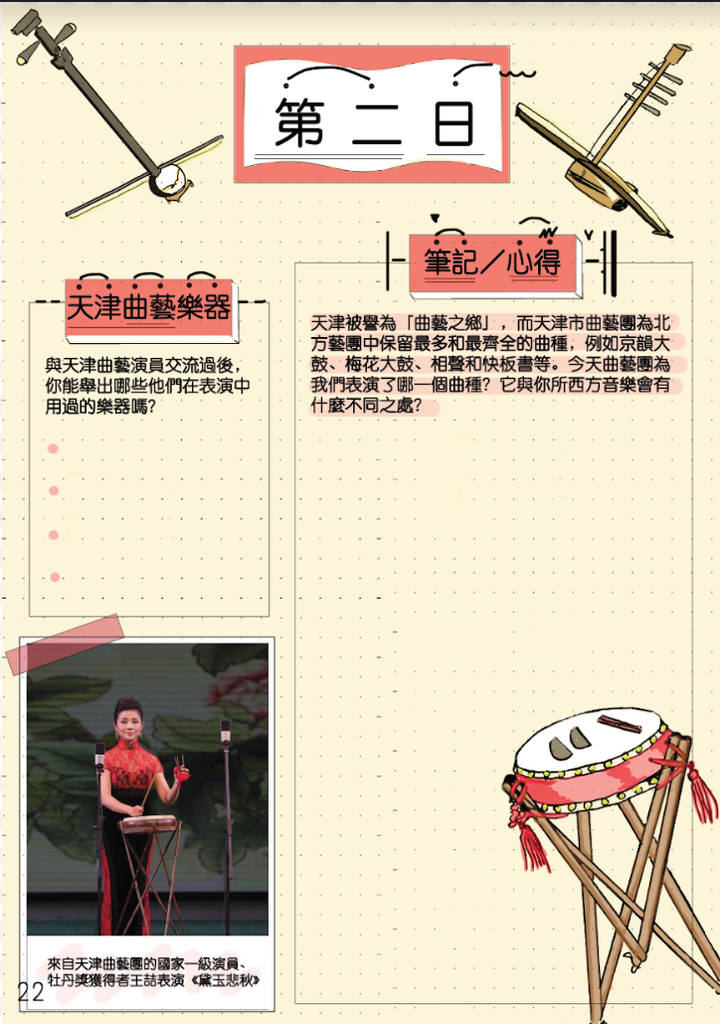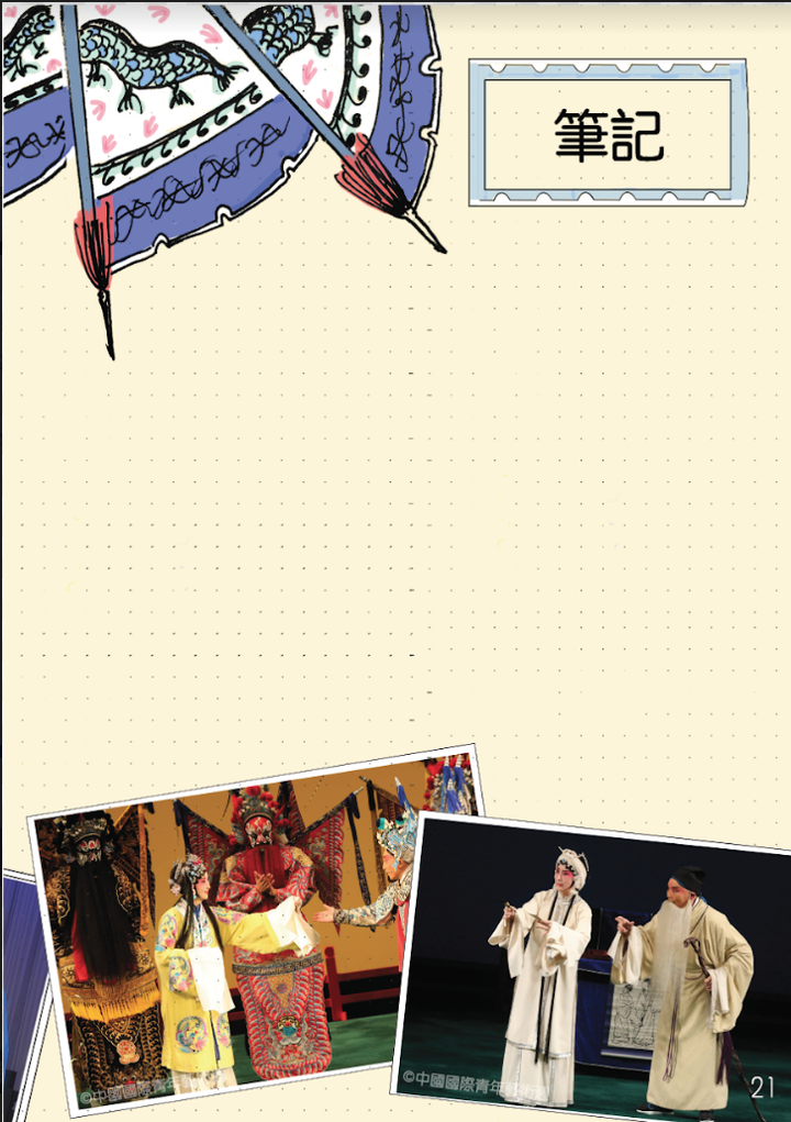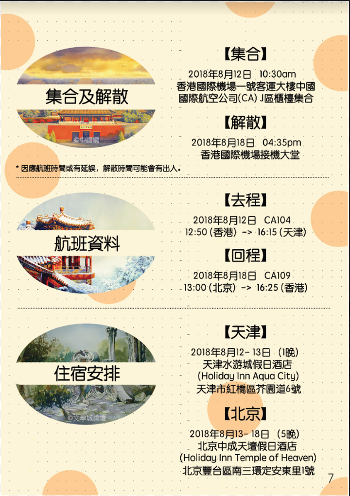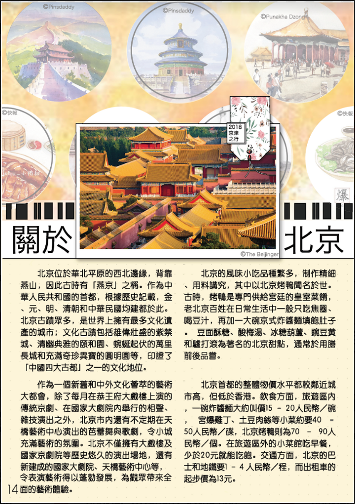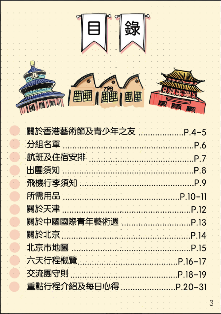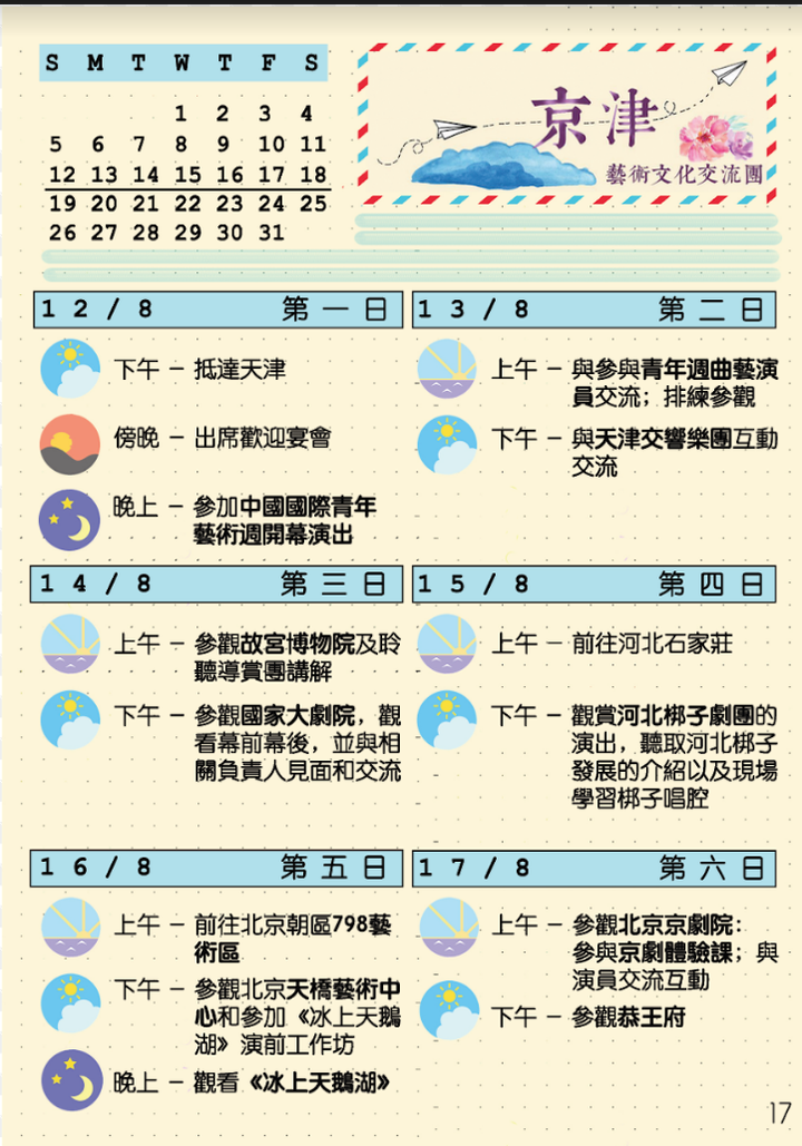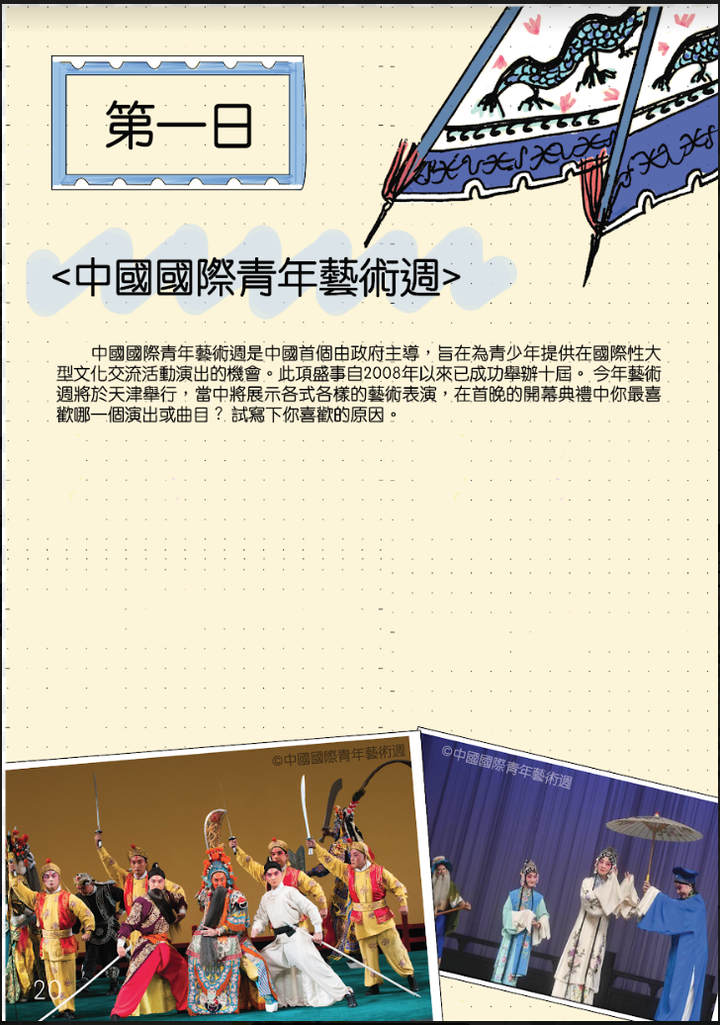 The 32-page booklet was meant to be accompanying with the exchange programme's participants in Beijing, Tianjin and Hebei. It is an educational booklet where students can pen down their thoughts and reflections after sightseeing ancient architecture, intriguing art performances as well as exhibitions in China. Half of its content documents the itinerary of the tour, instruction of being a participant of the tour and the information of organisers.