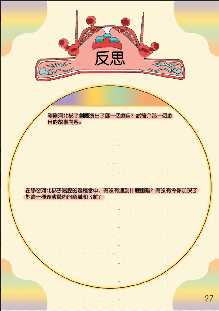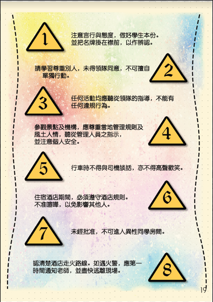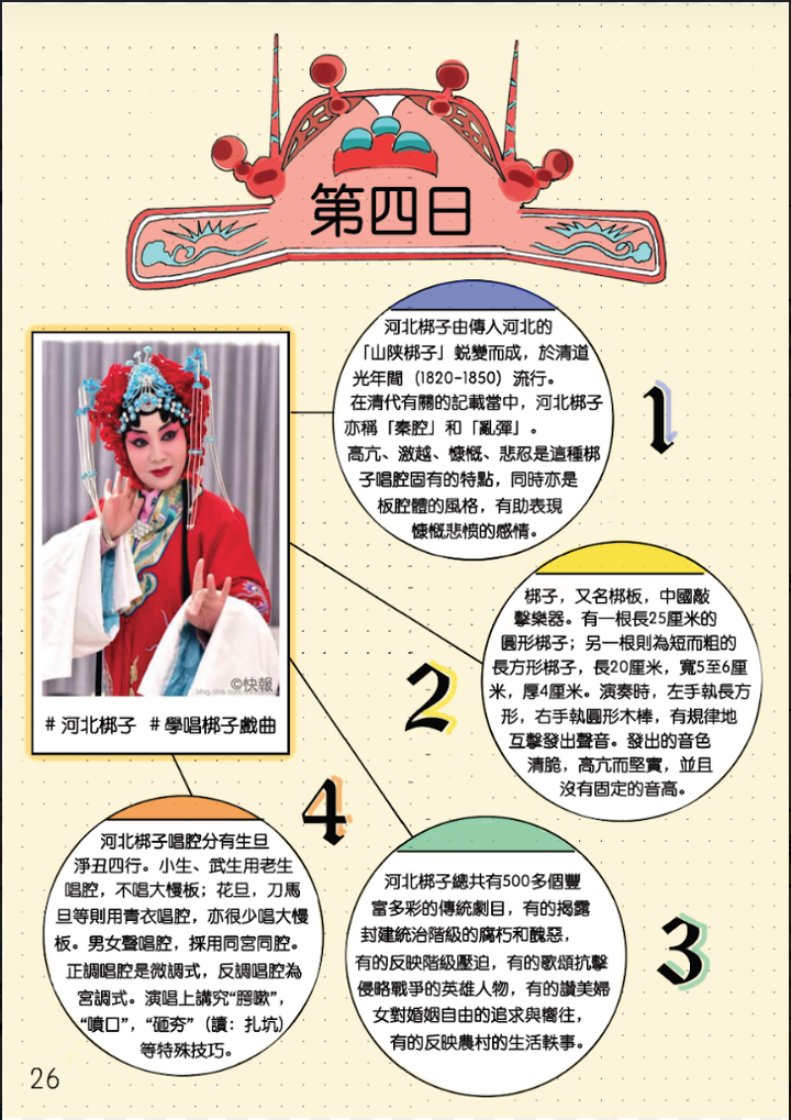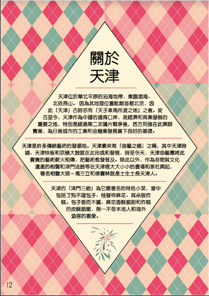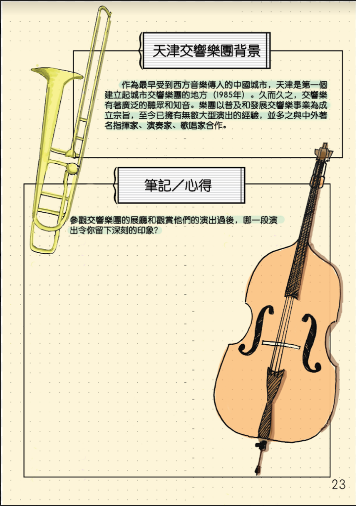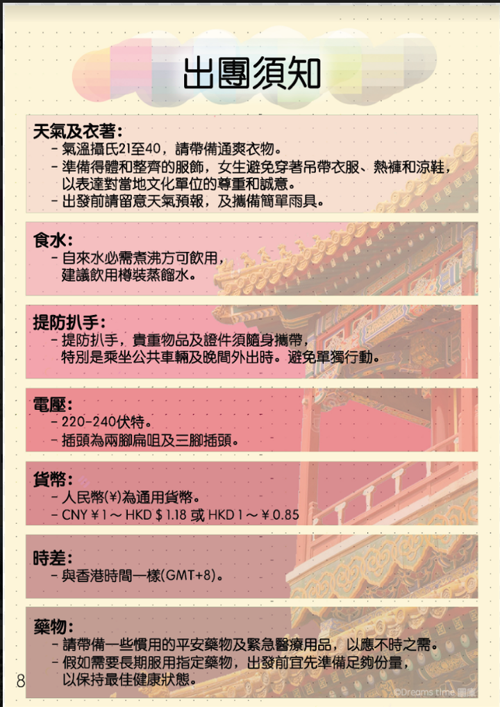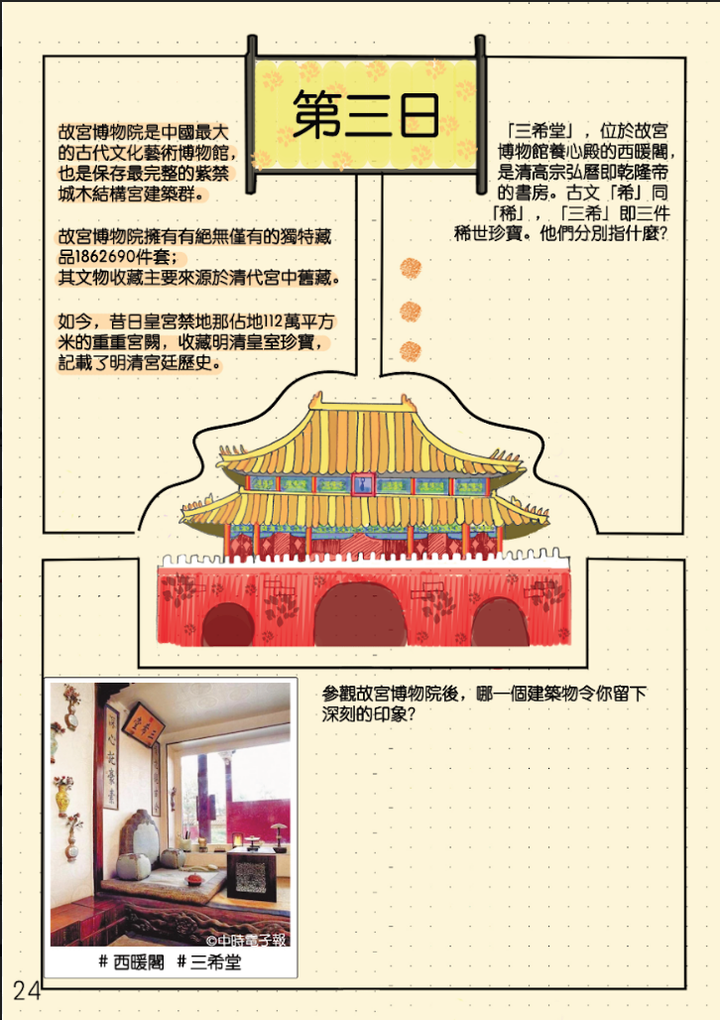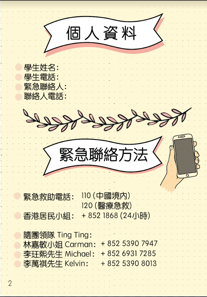 The 32-page booklet was meant to be accompanying with the exchange programme's participants in Beijing, Tianjin and Hebei. It is an educational booklet where students can pen down their thoughts and reflections after sightseeing ancient architecture, intriguing art performances as well as exhibitions in China. Half of its content documents the itinerary of the tour, instruction of being a participant of the tour and the information of organisers.