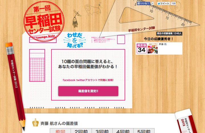 早稲田大学/高田馬場・早稲田エリアに関するおもしろ問題を問いて早稲田偏差値を決めるWEB&リアルイベント企画。WEBサイト上ではSNSログインにより偏差値を友達と競えるキャンペーン、また実際に"センター試験"を実施して最高得点者を表彰するイベントも開催。 #デザイン #企画