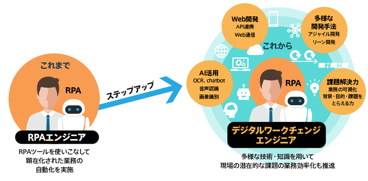 【上流工程を担える問題解決力などのスキル保有者を100名育成へ】 パーソルテクノロジースタッフでは、企業の生産性向上課題に取り組んでいますが、企業のRPA活用フェーズの変化とともに、RPAツールを用いた開発に加えて、複数の部門をまたいだ業務整理や業務の可視化・フロー化、RPA化業務の選