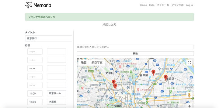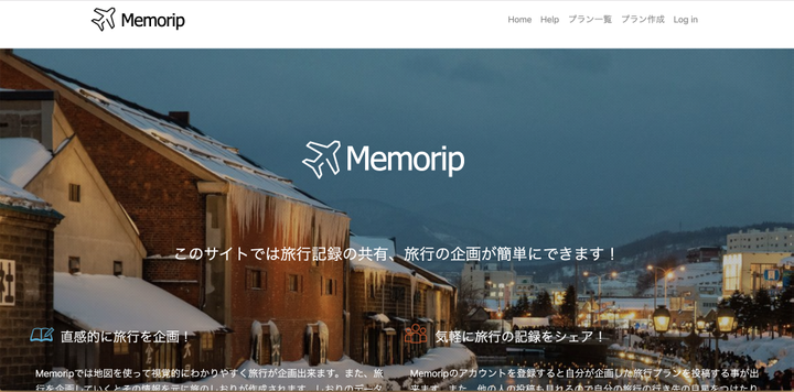 旅行の企画、しおりの投稿サービスです。 目的地入力部分の横に地図がついており、目的地間の距離などを確認しながら旅行の計画が立てられます。また旅行記SNSとしての機能も備わっています。(HTML, CSS, Javascript, Rails, Heroku)