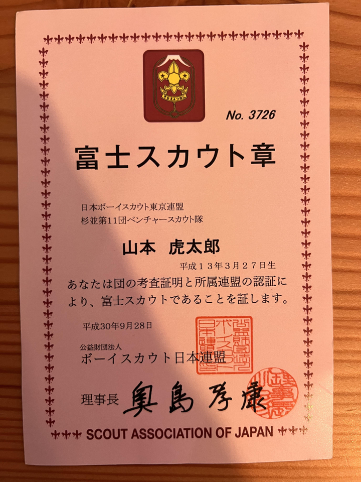小学1年生よりボーイスカウトに所属し、高校三年生で取得した章。 日本ボーイスカウトの進級制度において、最高位の章です